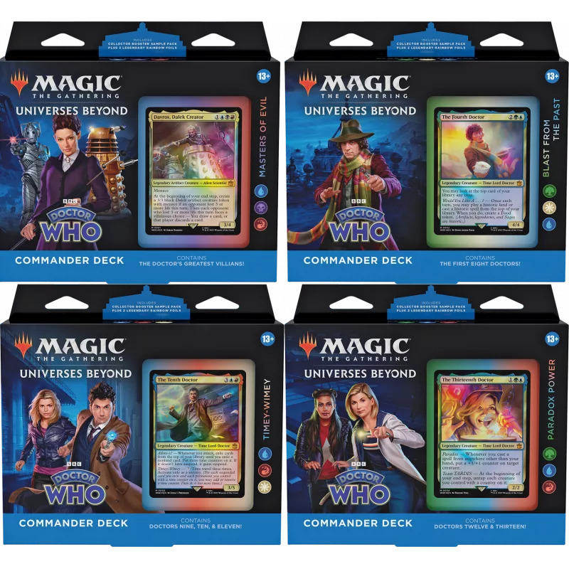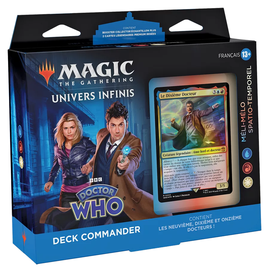 - Les deck Commander Doctor Who contiennent chacun 1 deck prêt-à-jouer de 100 cartes Magic (2 cartes légendaires Premium traditionnelles, 98 cartes non-Premium), 10 cartes Planechase, 1 dé planaire à six faces, 1 booster collector échantillon (contenant 2 cartes Premium traditionnelles ou non-Premium à traitement spécial, dont 1 carte courante ou inhabituelle et 1 carte de rareté rare ou supérieure), 1 commandant de présentation super Premium (un exemplaire de la carte de commandant sur du papier cartonné avec une texture Premium sur la bordure et l’illustration), 10 jetons recto-verso, 1 boîte de deck (pouvant contenir 100 cartes avec protège-cartes), 1 roue de points de vie, 1 feuillet de stratégie et 1 fiche de référence.