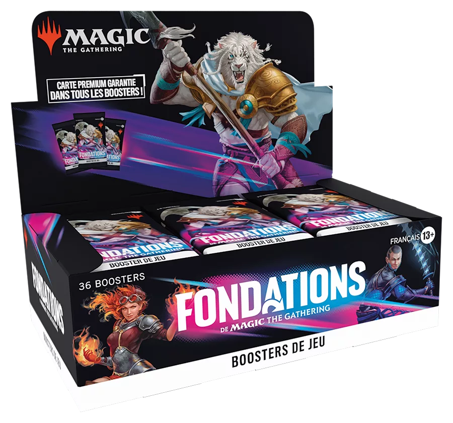 Le meilleur moment pour jouer votre première partie de Magic, c’est maintenant. Plongez dans Fondations pour créer et partager votre expérience Magic: The Gathering quintessentielle en jouant et en collectionnant des cartes sélectionnées pour donner à chaque joueur l’avantage. Cette boîte de boosters Fondations contient 36 boosters de jeu fondation, qui sont à la fois parfaits pour le format Limité et amusants à ouvrir. Chaque booster de jeu contient 14 cartes Magic: The Gathering et 1 carte de jeton/publicitaire ou carte d’illustration. (Vous trouverez une carte d’illustration normale dans 30 % des boosters et une carte d’illustration signature estampillée Premium dans 5 % des boosters.) Chaque booster inclut une combinaison de 1 à 4 cartes de rareté rare ou supérieure, 3 à 5 cartes inhabituelles, 6 à 9 cartes courantes et 1 carte de terrain (un terrain pleine illustration dans 25% des boosters). Une carte de n’importe quelle rareté est Premium traditionnelle. La carte de terrain est aussi Premium traditionnelle dans 20 % des boosters.