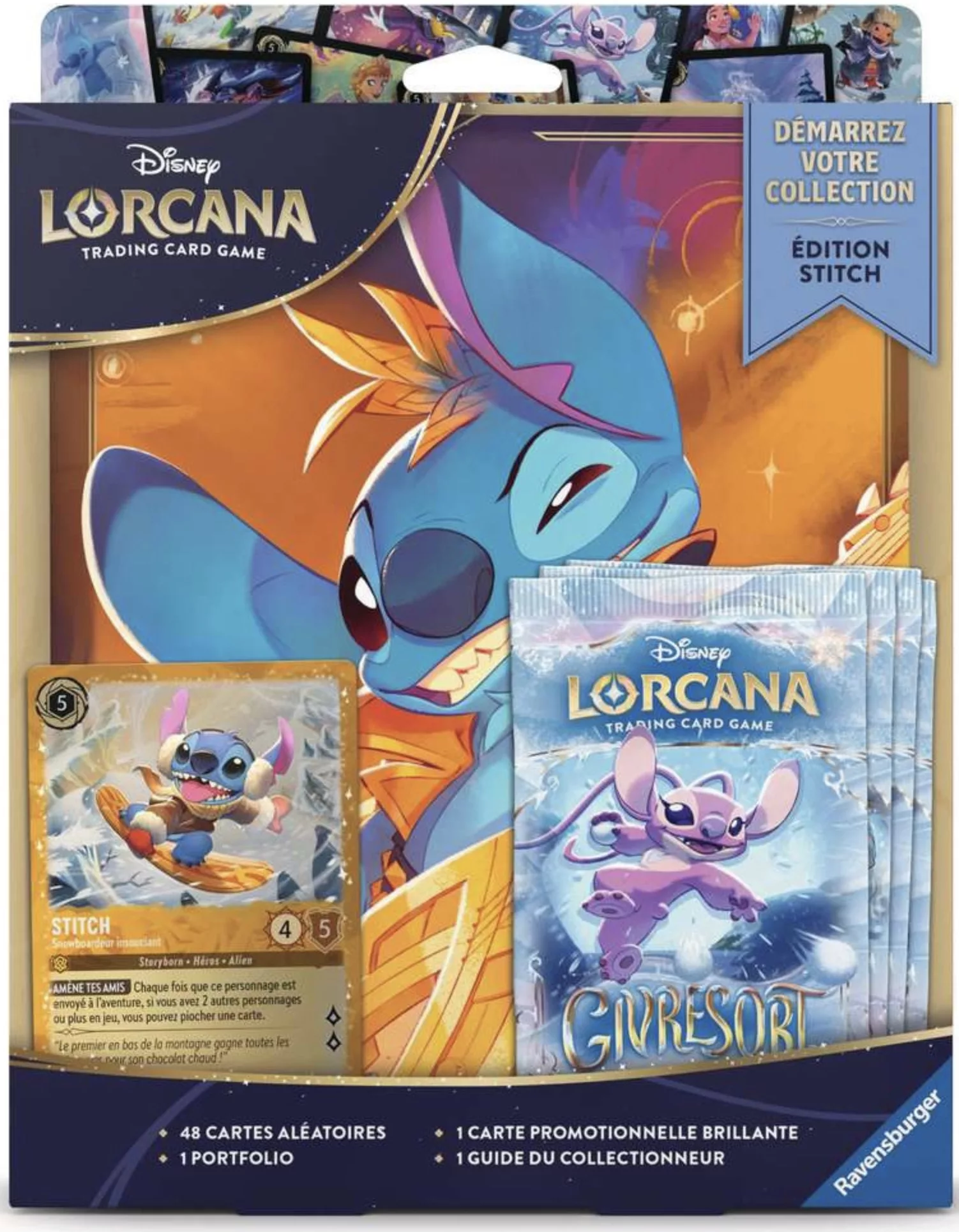 Ce coffret est un coffret de démarrage pour Lorcana comprenant 4 boosters du set Givresort, un guide du collectionneur, un portfolio A5 Stitch Rockstar pour ranger vos cartes et une carte promo brillante Stitch.
