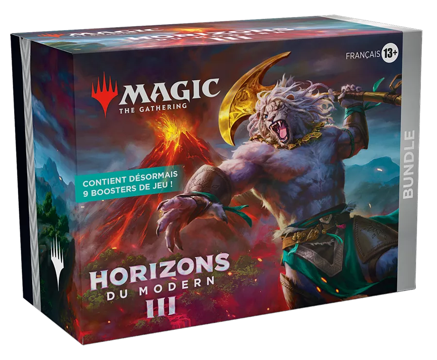 Ce bundle Horizons du Modern 3 inclut 9 boosters de jeu Horizons du Modern 3, plus une carte Premium traditionnelle arborant une illustration alternative exclusive au bundle, 15 cartes de terrain de base Premium traditionnelles (dont 5 terrains pleine illustration Premium), 15 cartes de terrain de base non-Premium (dont 5 terrains pleine illustration non-Premium), 1 compteur de points de vie Spindown géant, 1 boîte de rangement de cartes et 2 fiches de référence. Chaque booster de jeu contient 14 cartes Magic: The Gathering et 1 carte de jeton/publicitaire, carte d’aide ou carte d’illustration. (Vous trouverez une carte d’illustration normale dans 30 % des boosters et une carte d’illustration signature estampillée Premium dans 5 % des boosters.) Dans chaque booster vous trouverez une combinaison de 1 à 5 cartes de rareté rare ou supérieure, 3 à 6 cartes inhabituelles, 5 à 9 cartes courantes et 0 à 1 carte de terrain. Une carte de n’importe quelle rareté est Premium traditionnelle. 1 terrain de récupération sans bordure Premium dans <1 % des boosters. 1 terrain Premium traditionnel apparaît dans 20 % des boosters.