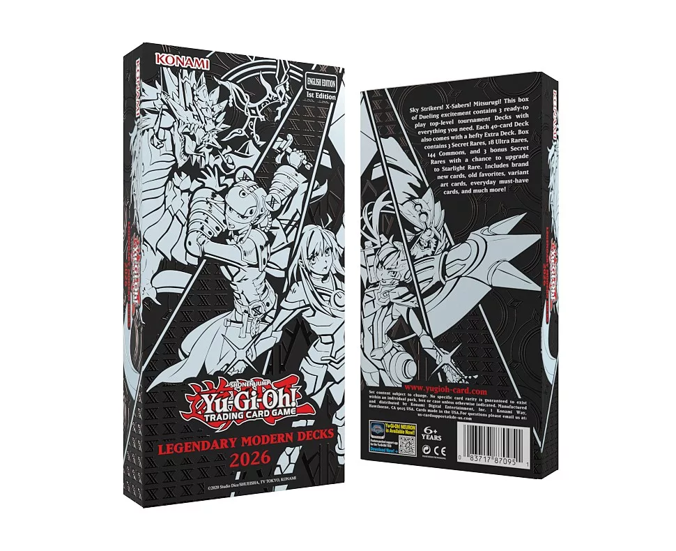 Legendary Modern Decks 2026 contient TROIS decks complets et prêts à jouer, chacun composé de 55 cartes (1 carte secrète rare, 6 cartes ultra rares et 48 cartes communes), plus une 56e carte bonus : un exemplaire supplémentaire de l’une des 6 cartes du deck, avec une chance supplémentaire de l’obtenir en version Starlight Rare ! Chaque deck est conçu pour les tournois, avec un Main Deck et un Extra Deck complets. De toutes nouvelles cartes sont incluses !