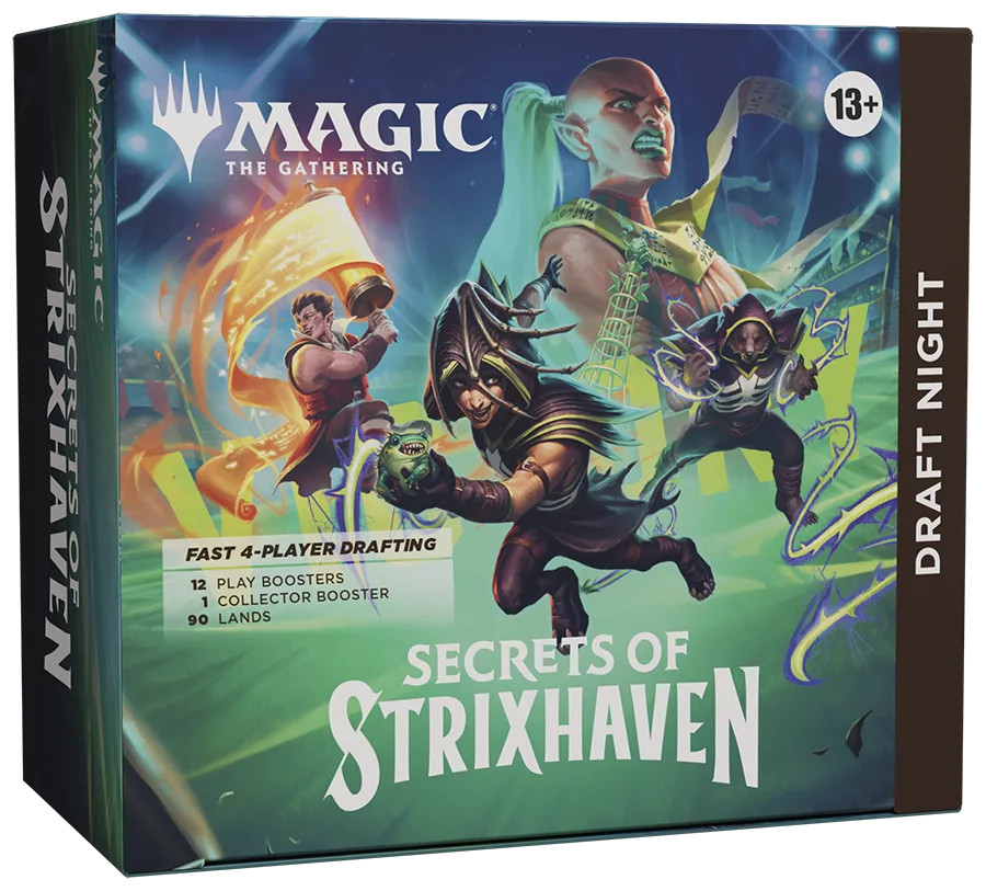 C’est une soirée de draft en boîte ! Soirée de draft contient tout le nécessaire pour organiser un Draft à deux choix avec seulement quatre joueurs. Le Draft à deux choix encourage un draft rapide, dynamique et idéal pour jouer sur table ou apporter un soupçon de variété à vos soirées jeux. Amenez l’extension Les secrets de Strixhaven à votre table pour une soirée jeux inoubliable.