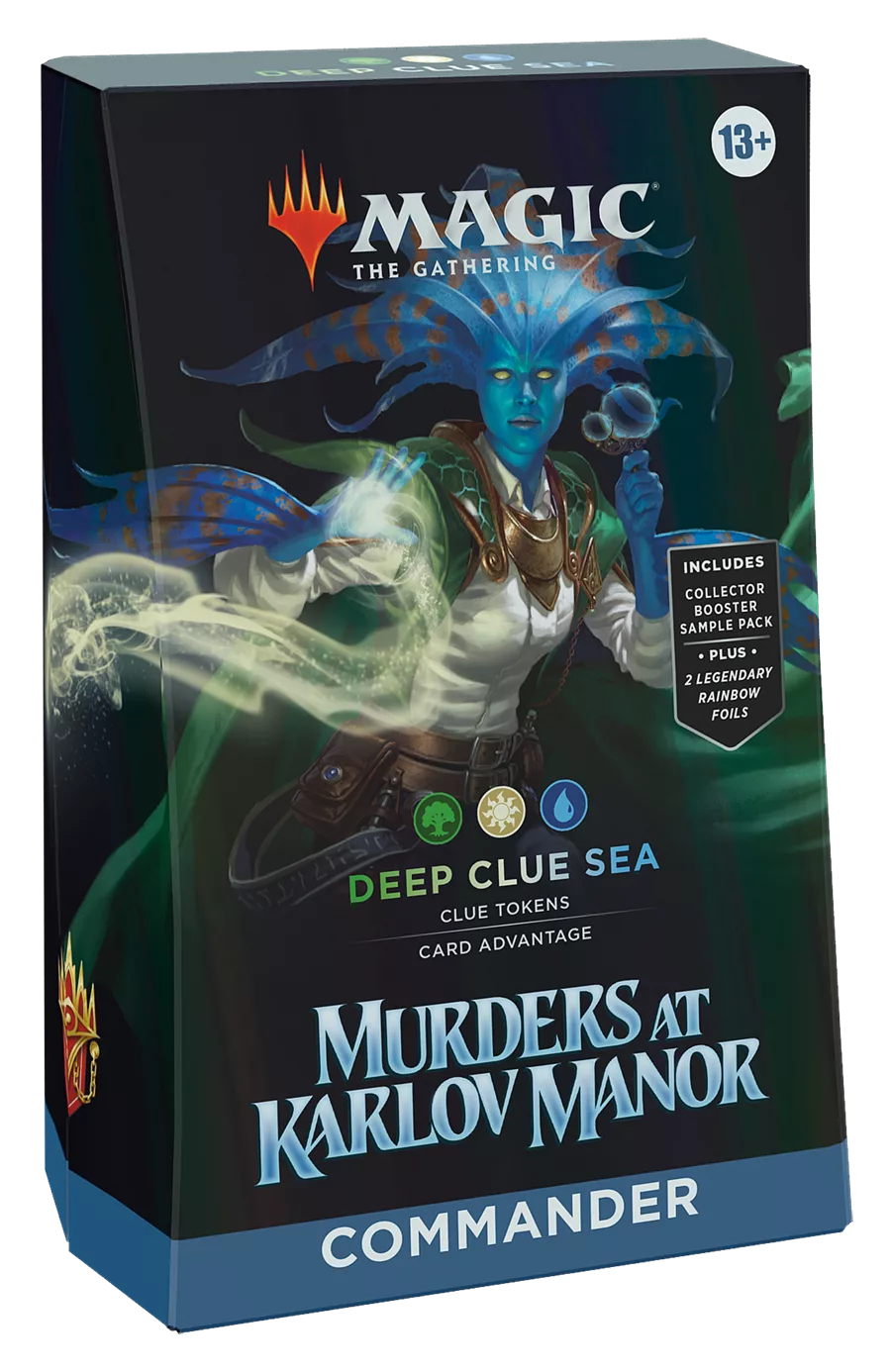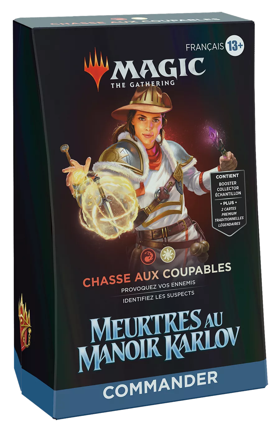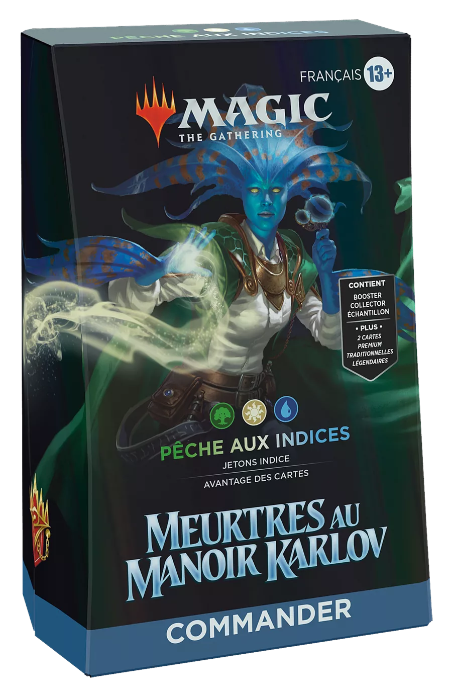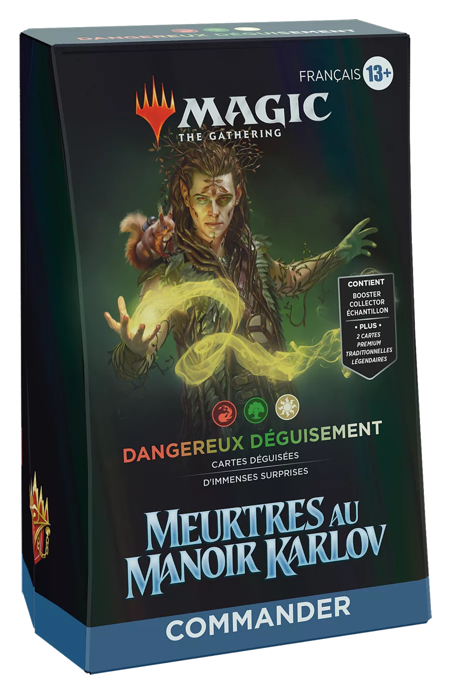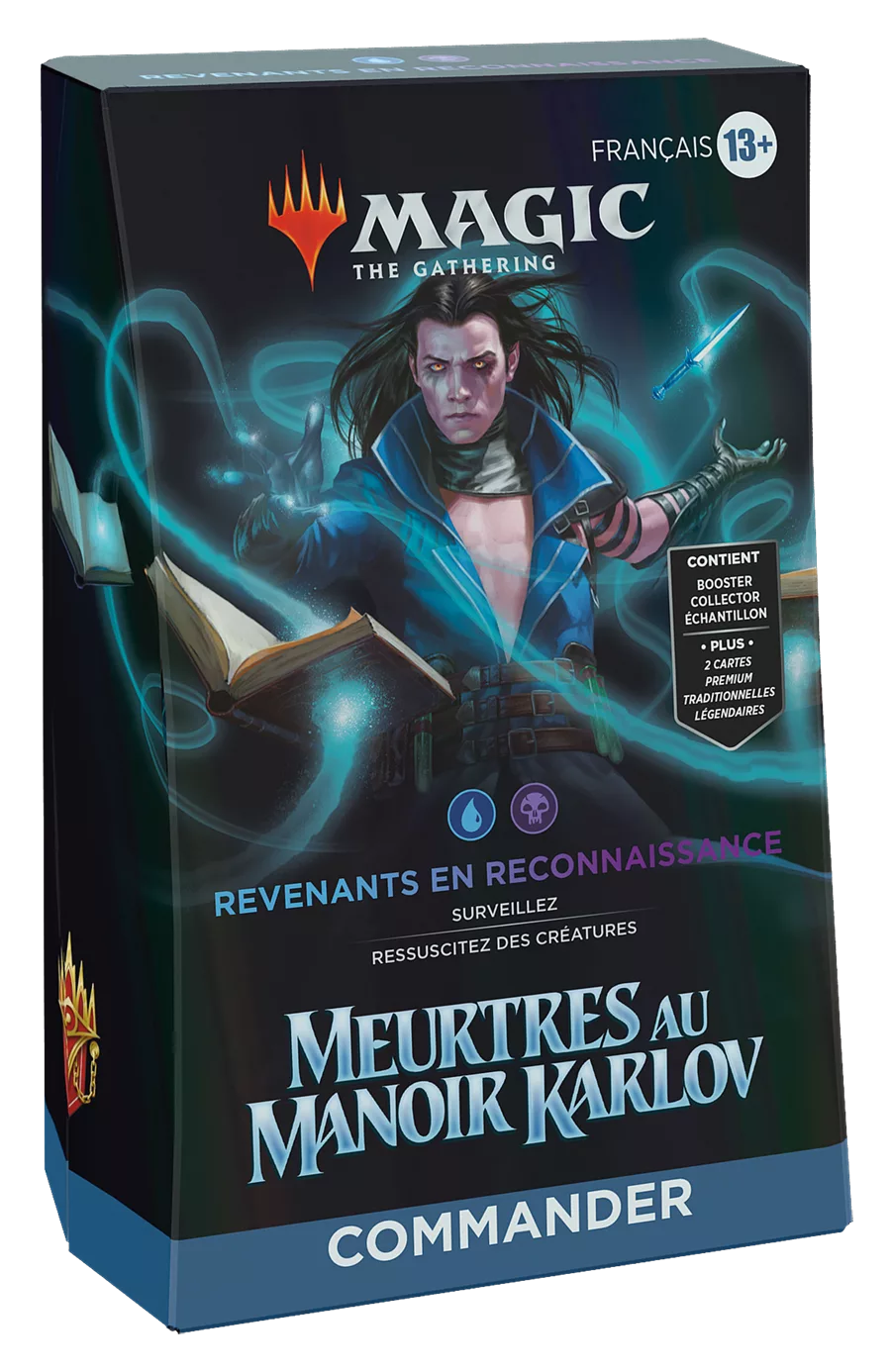 Chaque deck Commander Meurtres au manoir Karlov inclut 1 deck prêt-à-jouer de 100 cartes Magic (2 cartes de créature légendaire Premium traditionnelles, 98 cartes non-Premium), 1 booster collector échantillon de 2 cartes (contenant 1 carte à traitement spécial Premium traditionnelle ou non-Premium de rareté rare ou supérieure et 1 carte inhabituelle sans bordure Premium traditionnelle), 1 commandant de présentation super Premium (un exemplaire de la carte de commandant sur du papier cartonné avec une texture Premium sur la bordure et l’illustration), 10 jetons recto-verso, 1 carte d’aide, 1 boîte de deck (pouvant contenir 100 cartes avec protège-cartes), 1 roue de points de vie, 1 feuillet de stratégie et 1 fiche de référence.