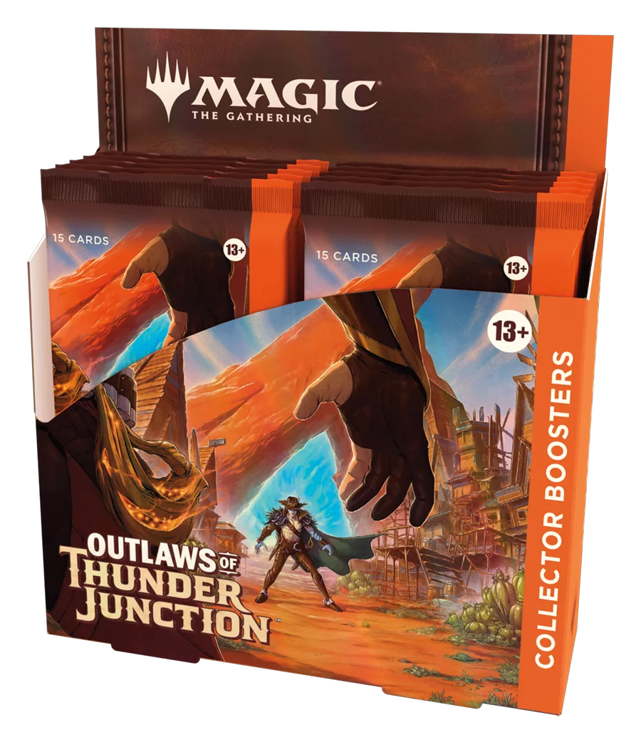 Galopez vers le crépuscule avec une boîte de boosters collector Les hors-la-loi de Croisetonnerre remplie de trésors. Dans cette boîte, vous trouverez 12 boosters collector Les hors-la-loi de Croisetonnerre, contenant chacun 15 cartes Magic: The Gathering et 1 jeton recto-verso Premium traditionnel, dont 5 cartes de rareté rare ou supérieure, 5 inhabituelles, 4 courantes et 1 carte de terrain à paysage Western pleine illustration. Chaque booster contient 6 cartes à bordure alternative, un total de 10 à 12 cartes Premium traditionnelles brillantes, et peut également contenir une carte arborant un traitement Premium spécial, exclusif aux boosters collector. 1 carte Dernières nouvelles avec une texture Premium dans <1 % des boosters.
