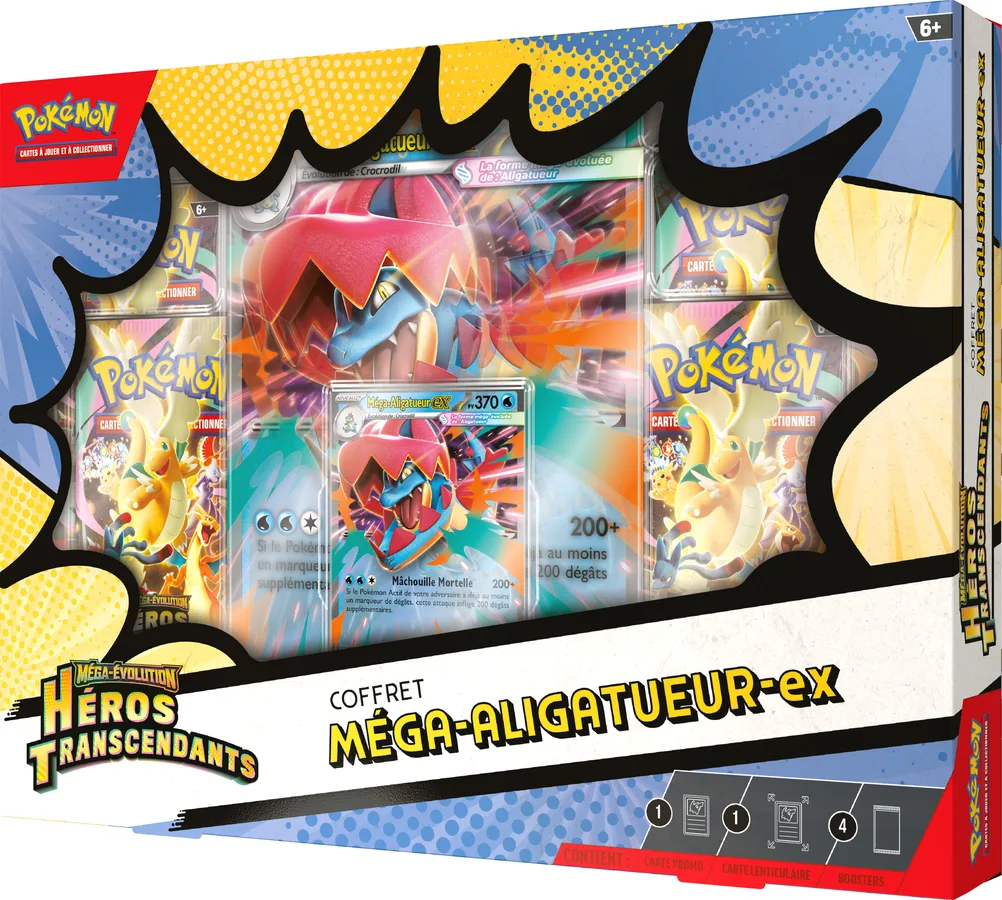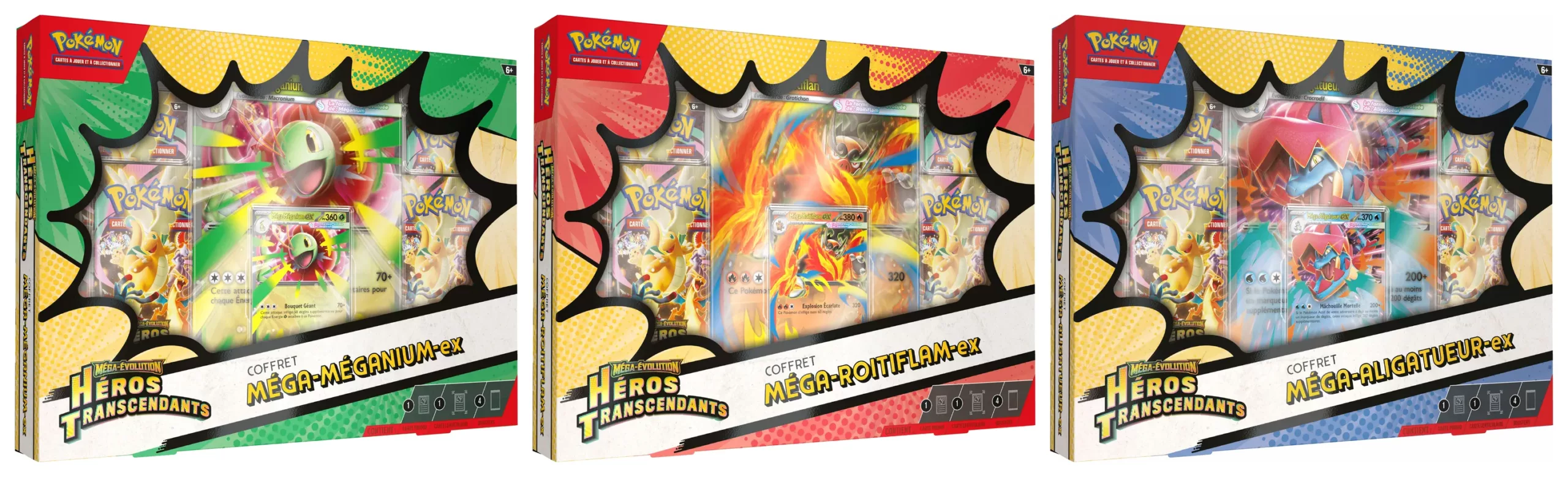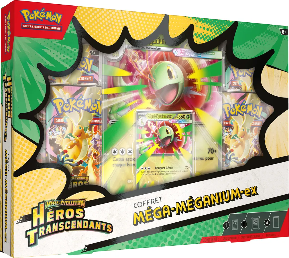 Chaque Coffret Méga-Évolution – Héros Transcendants – Méga-Méganium-ex/Méga-Roitiflam-ex/Méga-Aligatueur-ex contient :
