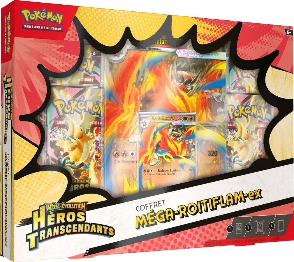 Forgez un lien qui développe la force de votre partenaire Pokémon au-delà de ses limites avec la Méga-Évolution ! Dans ces coffrets, vous trouverez une carte promo brillante pour le jeu, ainsi qu’une carte grand format lenticulaire avec une illustration dynamique et quatre boosters de l’extension spéciale Méga-Évolution – Héros Transcendants.