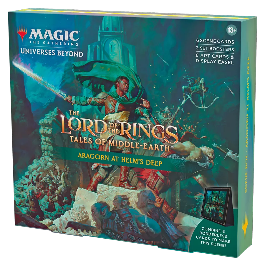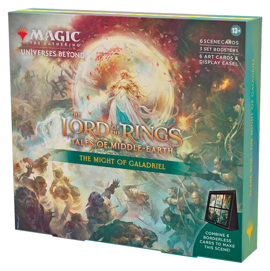 Boîte scénique Magic: The Gathering Le Seigneur des Anneaux : chroniques de la Terre du Milieu (6 cartes scéniques, 6 cartes d’illustration, 3 boosters d’extension + chevalet de présentation)